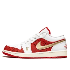La Air Jordan 1 Low Spades est une basket basse avec une base rouge agrémentée de motifs discrets. La chaussure présente des empiècements blancs qui s’harmonisent bien avec la tige, la semelle intérieure et les lacets. On découvre également des broderies dorées « K » et « Q » qui représentent respectivement les symboles de la carte du Roi et de la carte Pique. Plus bas, la outsole rouge vient peaufiner le design de la chaussure.
