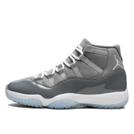 La Air Jordan 11 Retro Cool Grey (2021) arbore une base grise dans un mélange de suède et de cuir verni. Au niveau du col de la cheville, un Jumpman est brodé sur la chaussure. Ses lacets gris argent sont ronds. Sous les pieds, on distingue une semelle intermédiaire blanche et une outsole icy.