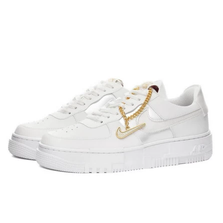 La Nike Air Force 1 Low Pixel Grey Gold Chain, une paire qui paraît très sobre, en blanc et gris clair, et qui pourtant fait partie des plus belles présente une empeigne parée d’empiècements en satin, cuir et velours côtelé. La première chose que l’on remarque est certainement le pendentif Swoosh doré et sa chaîne, qui apportent de la sophistication. La semelle blanche est elle aussi très détaillée car elle représente une image pixellisée.