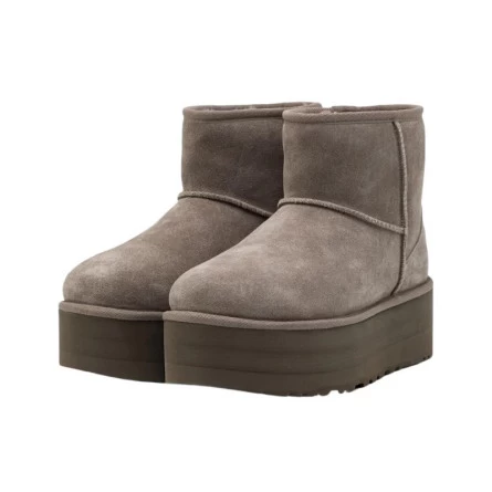 La boot UGG Classic Mini Platform Plume est une réinterprétation audacieuse et moderne de la silhouette emblématique de la marque. Cette UGG Boot Platform Plume se distingue par sa tige en suède de couleur taupe grisé, douce au toucher et riche en texture, et est rehaussée par des surpiqûres apparentes qui accentuent son allure artisanale. La UGG Classic Mini Gris repose sur une plateforme épaisse et une semelle extérieure dentelée qui non seulement donnent de la hauteur et une présence impressionnante, mais assurent également une adhérence optimale. Le tirant à l’arrière facilite l’enfilage, tandis que le logo discret de la marque sur le talon certifie son authenticité. Ce modèle de UGG Classic Ultra Mini Platform conjugue parfaitement le confort légendaire de UGG avec un style contemporain, offrant une version élégante et fonctionnelle adaptée aux tendances actuelles de la mode urbaine.